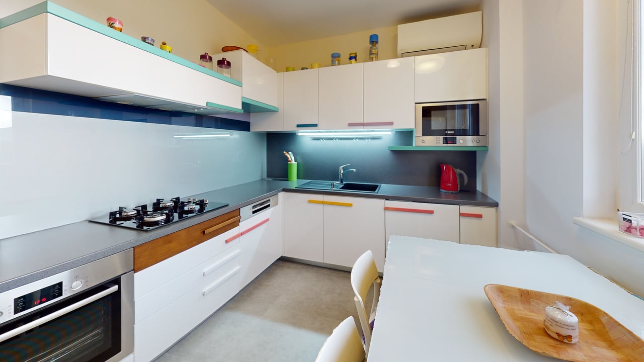 Kuchyňa, súčasťou ktorej je kuchynská linka vyššieho štandardu doplnená o kvalitné kuchynské spotrebiče, poskytuje nielen estetické, ale svojim prepojením s komorou aj praktické prostredie pre prípravu jedál. Byt disponuje dvomi klimatizačnými jednotkami, zabezpečujúcimi ideálnu teplotu počas celého roka a ponúka tiež veľkorysé úložné priestory vrátane vstavaných skríň.