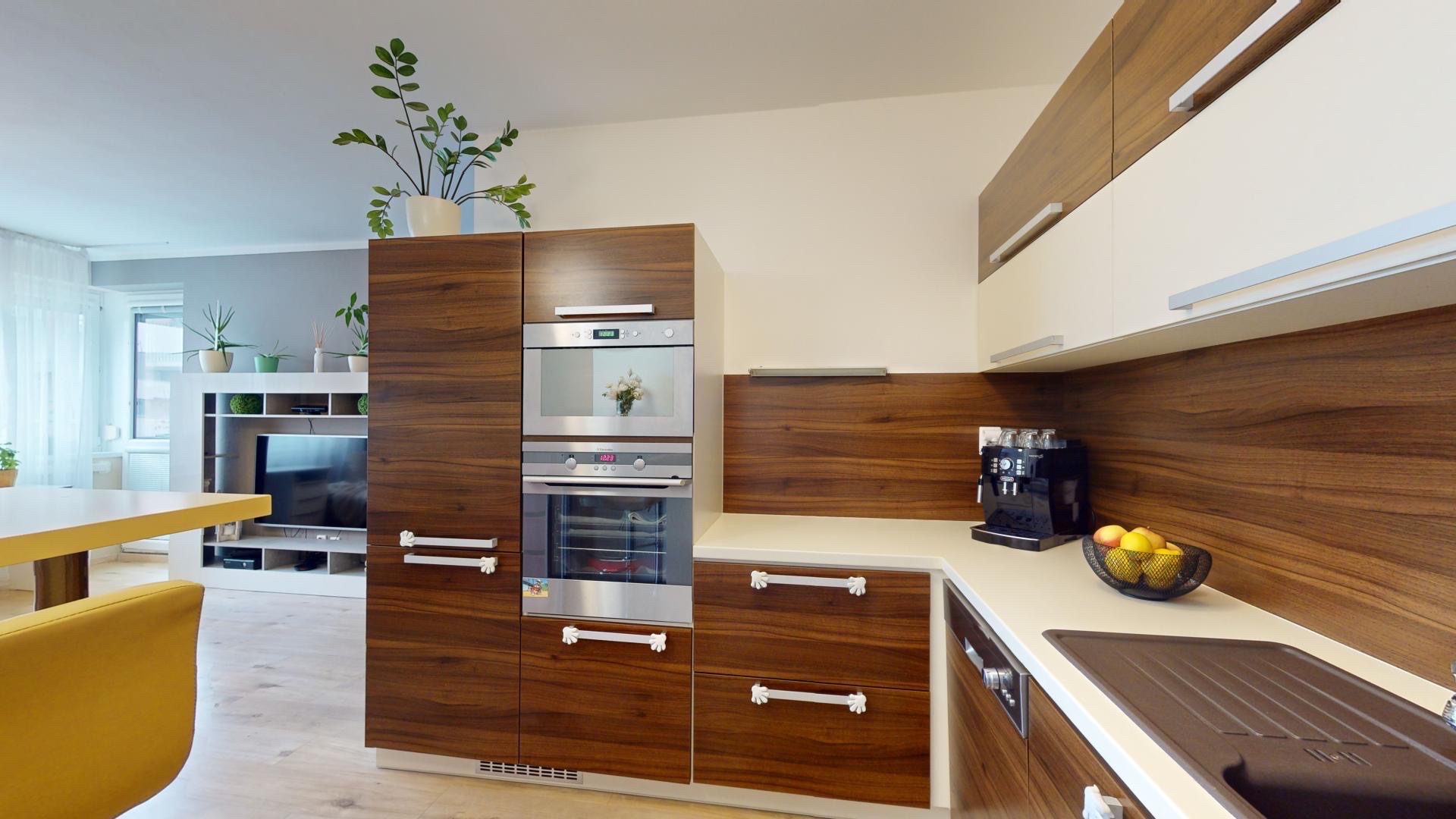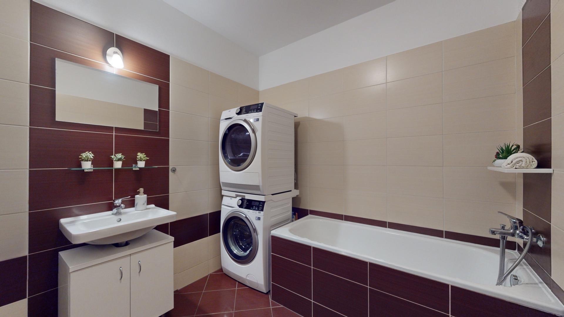 Cez vstupnú predsieň a chodbu sa dostanete do priestrannej obývačky prepojenej s kuchyňou a jedálenskou časťou. Z chodby je vstup do spálne so samostatným šatníkom a veľkej kúpeľne s vaňou a toaletou. Z obývačky aj zo spálne je východ na lodžiu orientovanú na západ. Obývacia izba aj spálňa je vďaka svojej orientácii do vnútrobloku tichá.